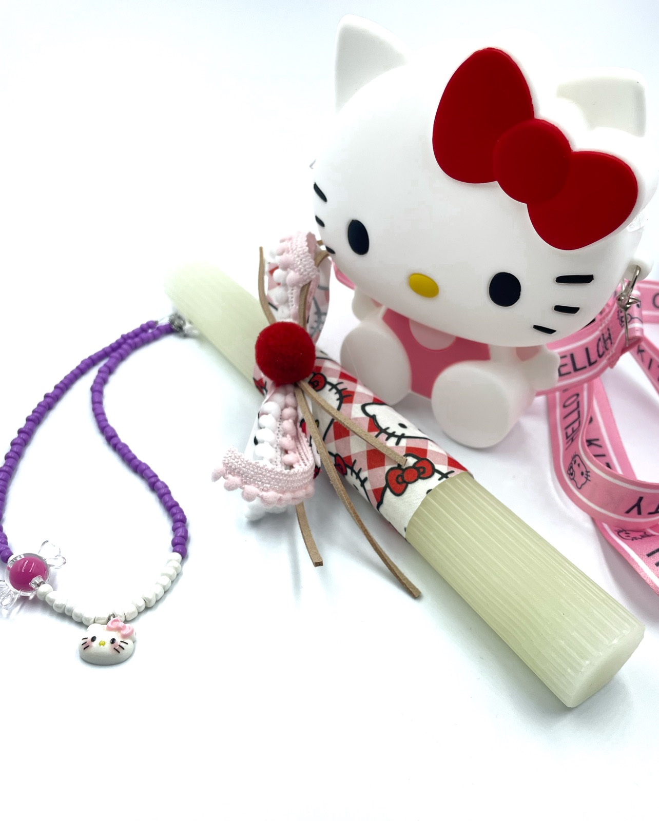 Αρωματική λαμπάδα HELLO KITTY τσαντάκι με ιμάντα, κολιέ HELLO KITTY και αυτοκόλλητα.