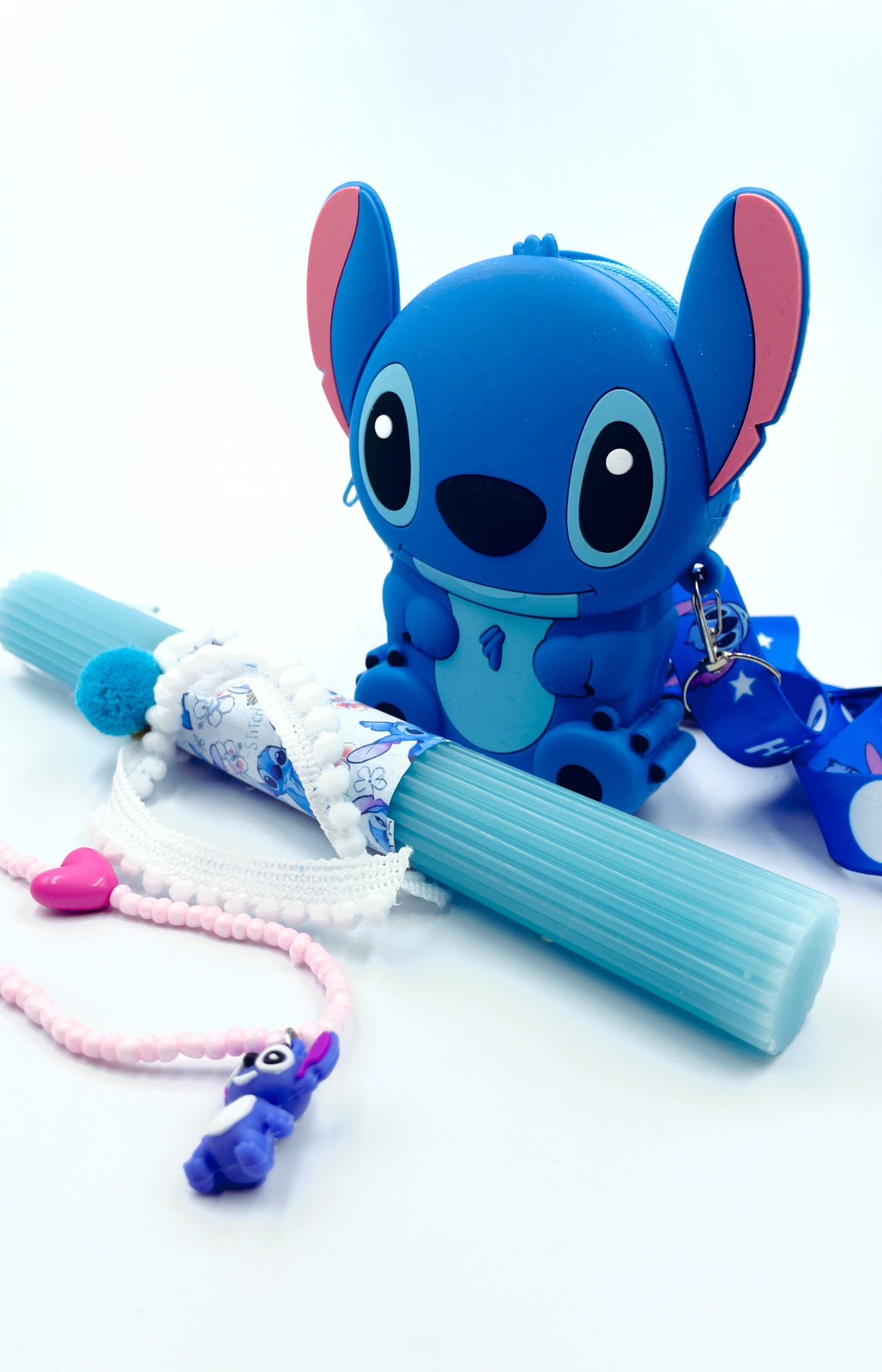 Αρωματική λαμπάδα STITCH τσαντάκι με ιμάντα, κολιέ stitch και αυτοκόλλητα.