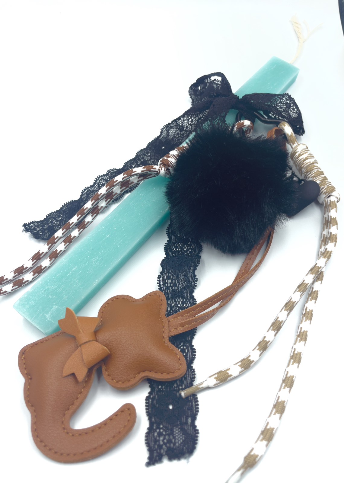 - Χαρακτηριστικά:• Αρωματική λαμπάδα• Χρώμα: τιρκουάζ• Διακόσμηση με δαντέλα και κορδόνια• Αφαιρούμενο charm – μπρελόκ για τσάντα ή πορτοφόλι• Διακοσμητικά στοιχεία: pom-pom, καρδιά και γατάκι.