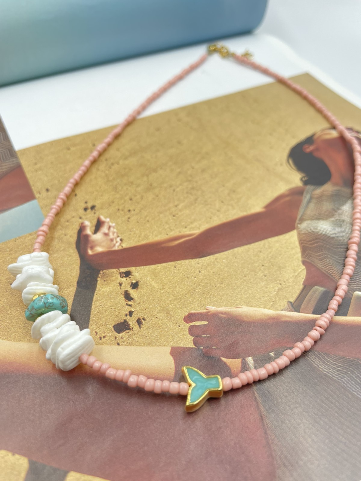 Χειροποίητο κολιέ σε παλ αποχρώσεις με ημιπολύτιμες χάντρες και ατσάλινα στοιχεία.