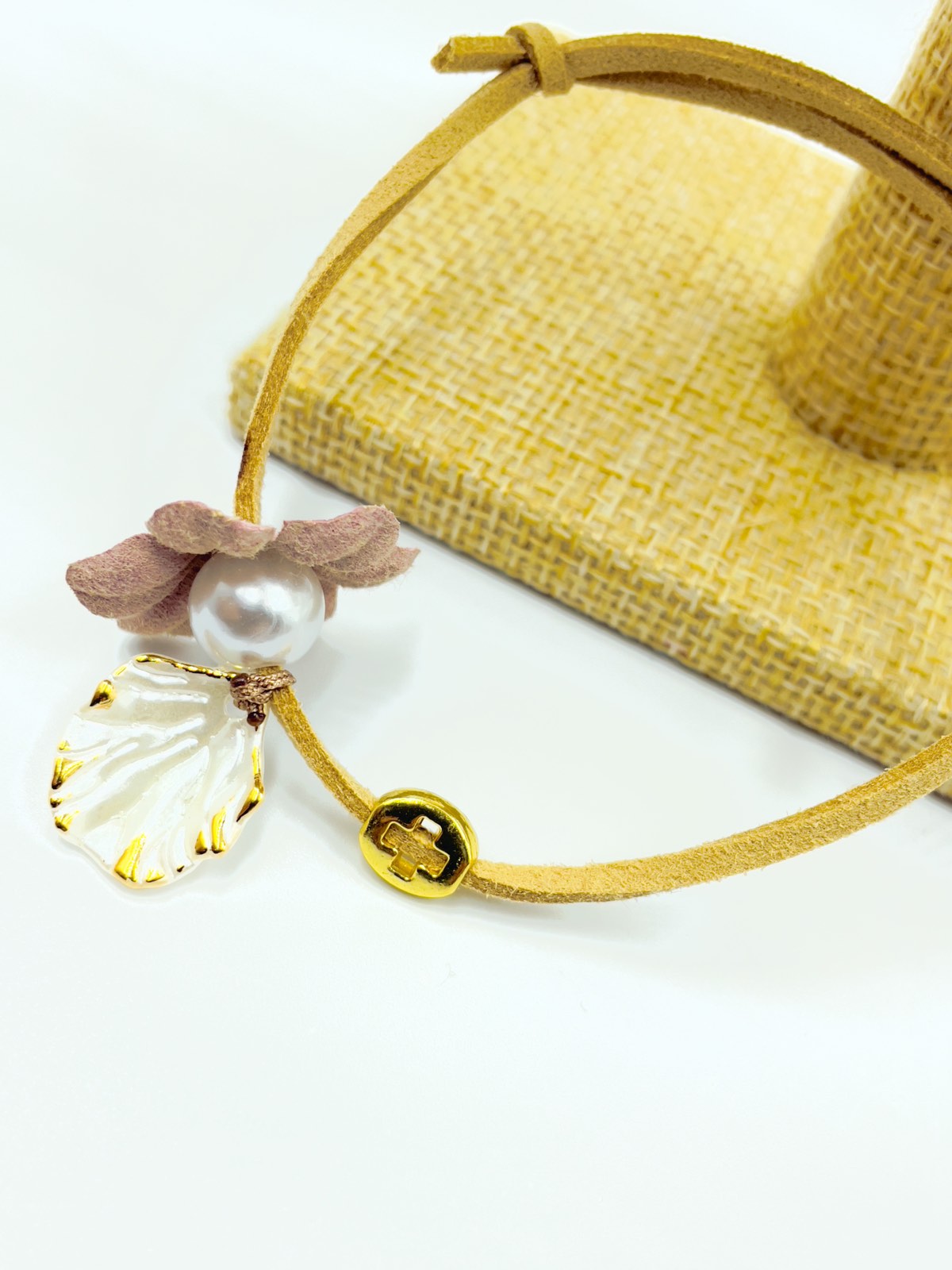 Μαρτυρικό καστόρινο βραχιόλι με κοχύλι λουλούδι υφασμάτινο και σταυρό.