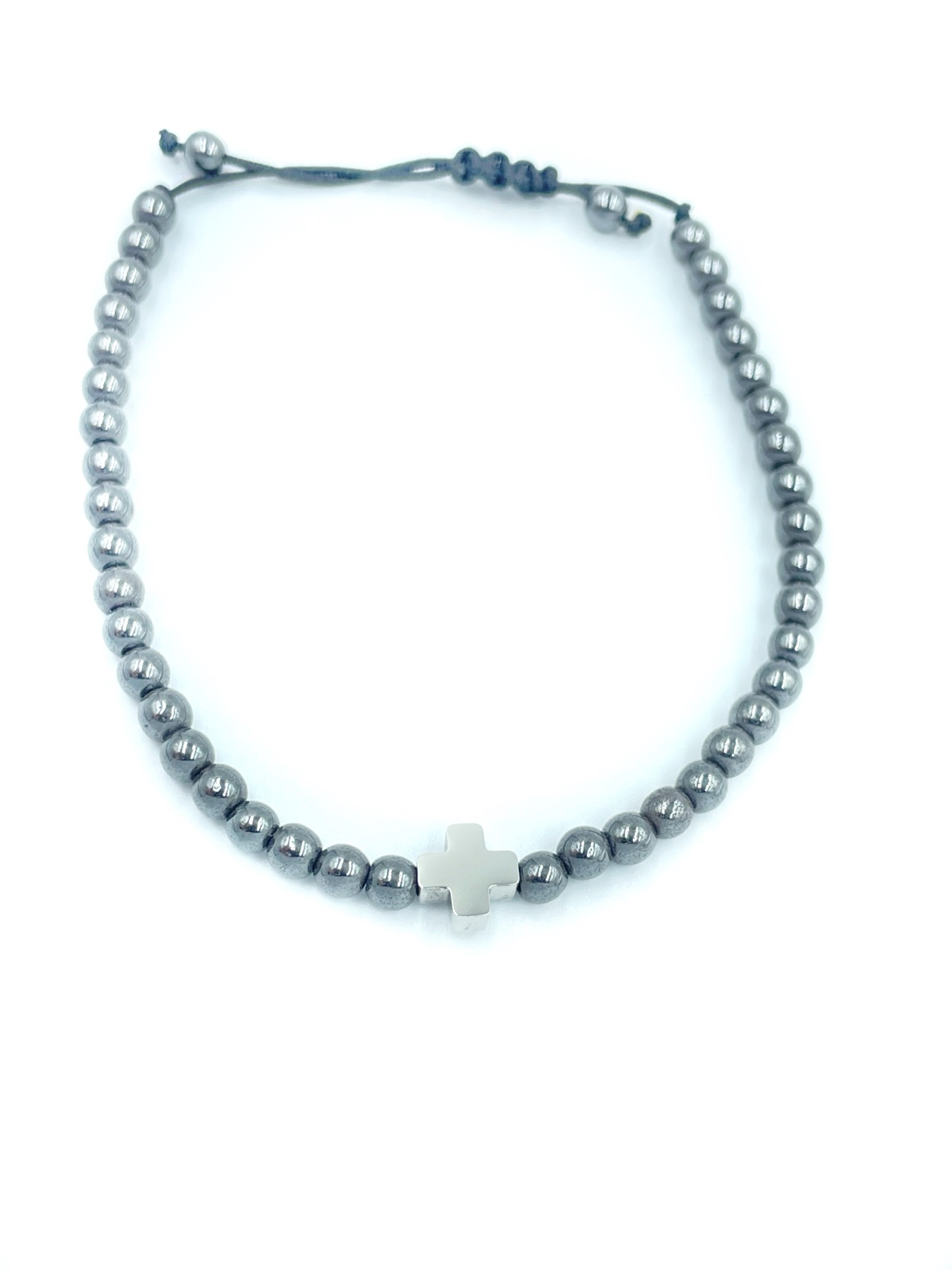 Χειροποίητο βραχιόλι ανδρικό με ατσάλινο σταυρό και χάντρα αιματίτη.