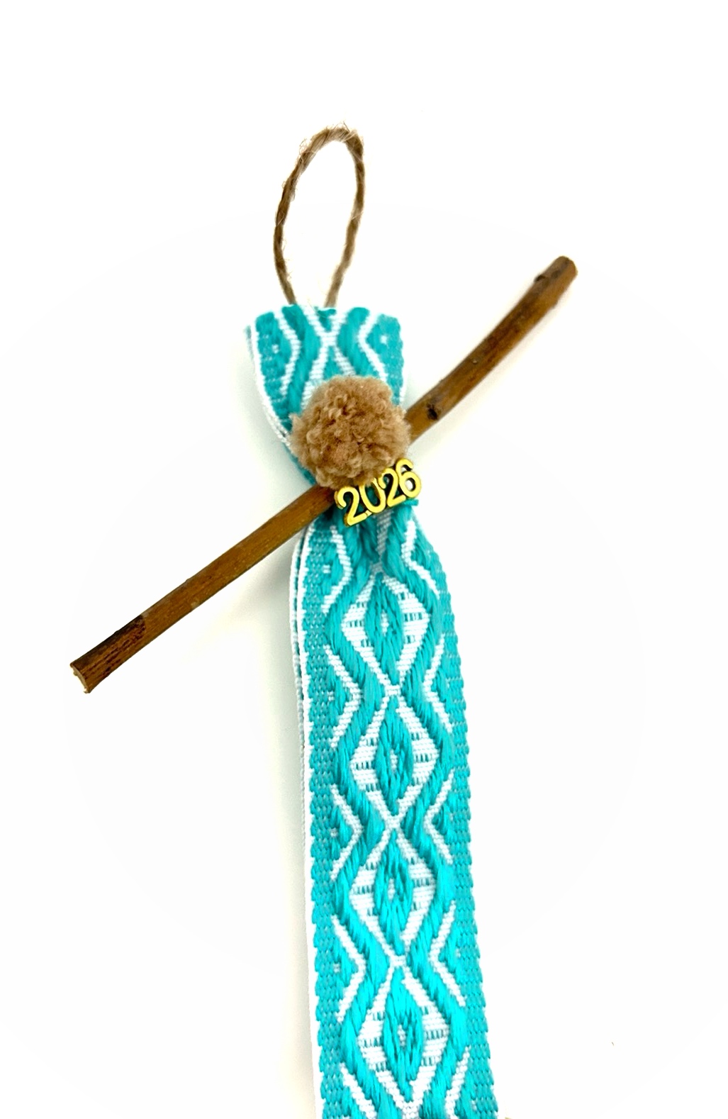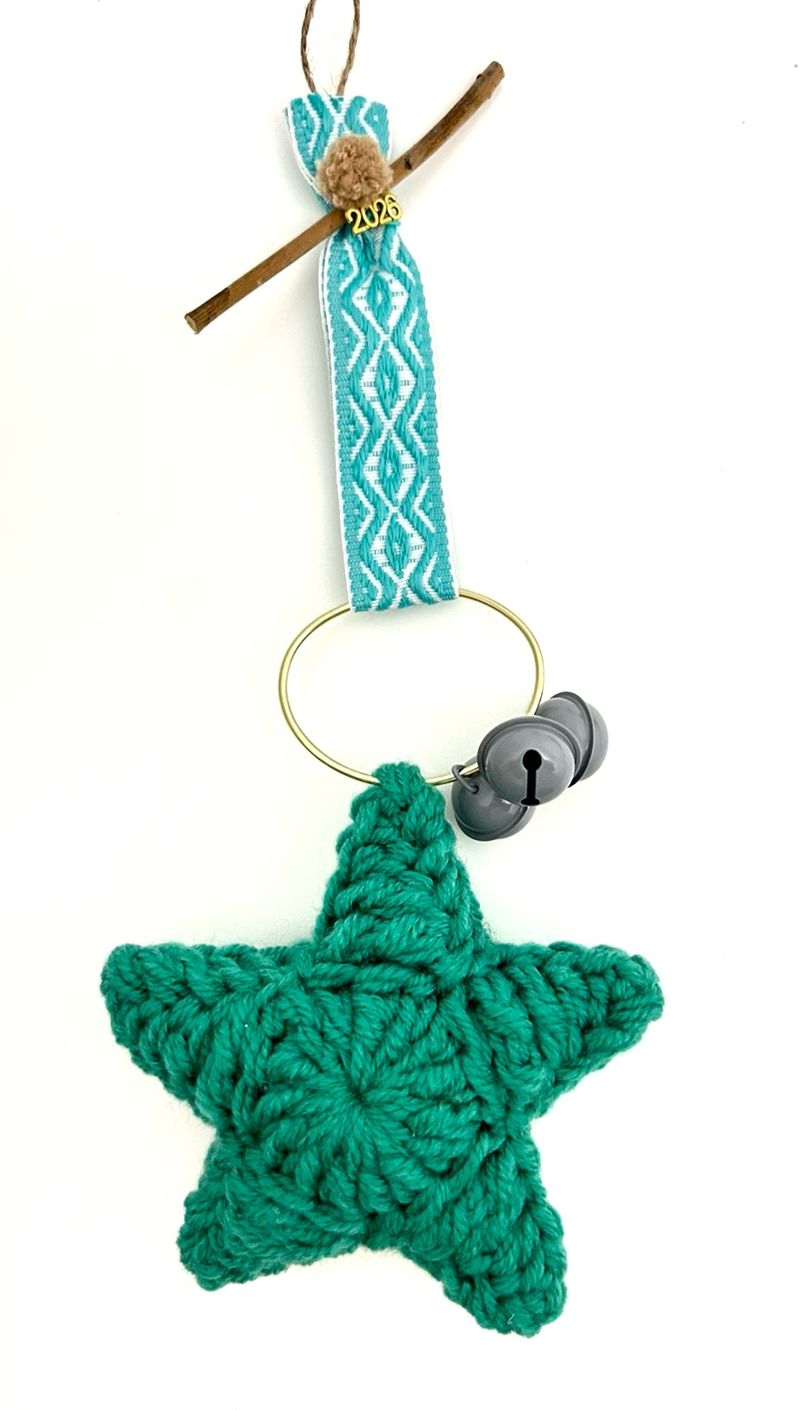 Χειροποίητο γούρι 2026 πλεχτό αστέρι με τρέσα και κουδουνάκια.