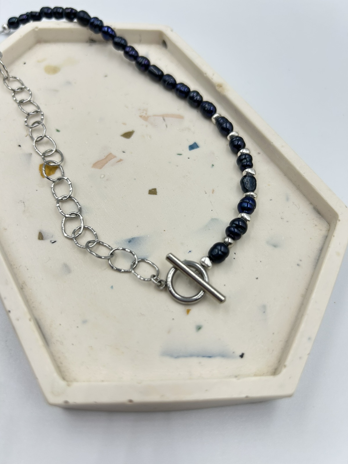 Χειροποίητο κολιέ αλυσίδα με κρίκους και μια σειρά μαργαριτάρι καλλιέργειας μαύρο με ατσάλινα στοιχεία.