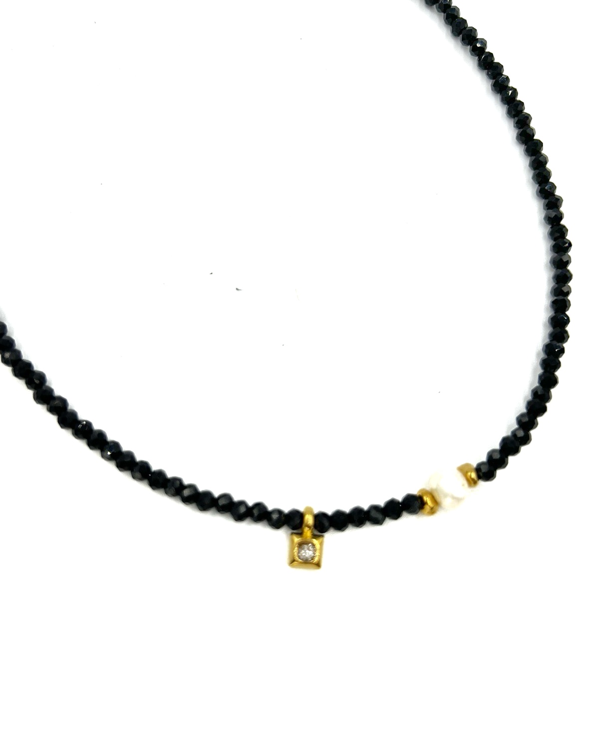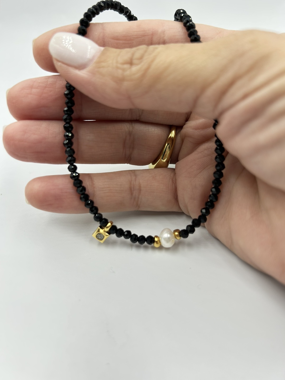 Χειροποίητο κολιέ μαύρο κρυσταλλάκι με ατσάλινα στοιχεία και μαργαριτάρι καλλιέργειας.