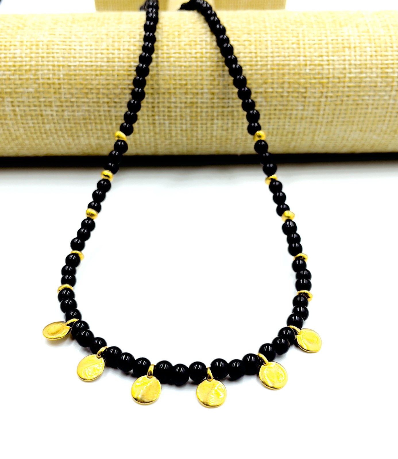 Χειροποίητο κολιέ με ημιπολύτιμες χάντρες όνυχας και λάβα με ατσάλινα στοιχεία.