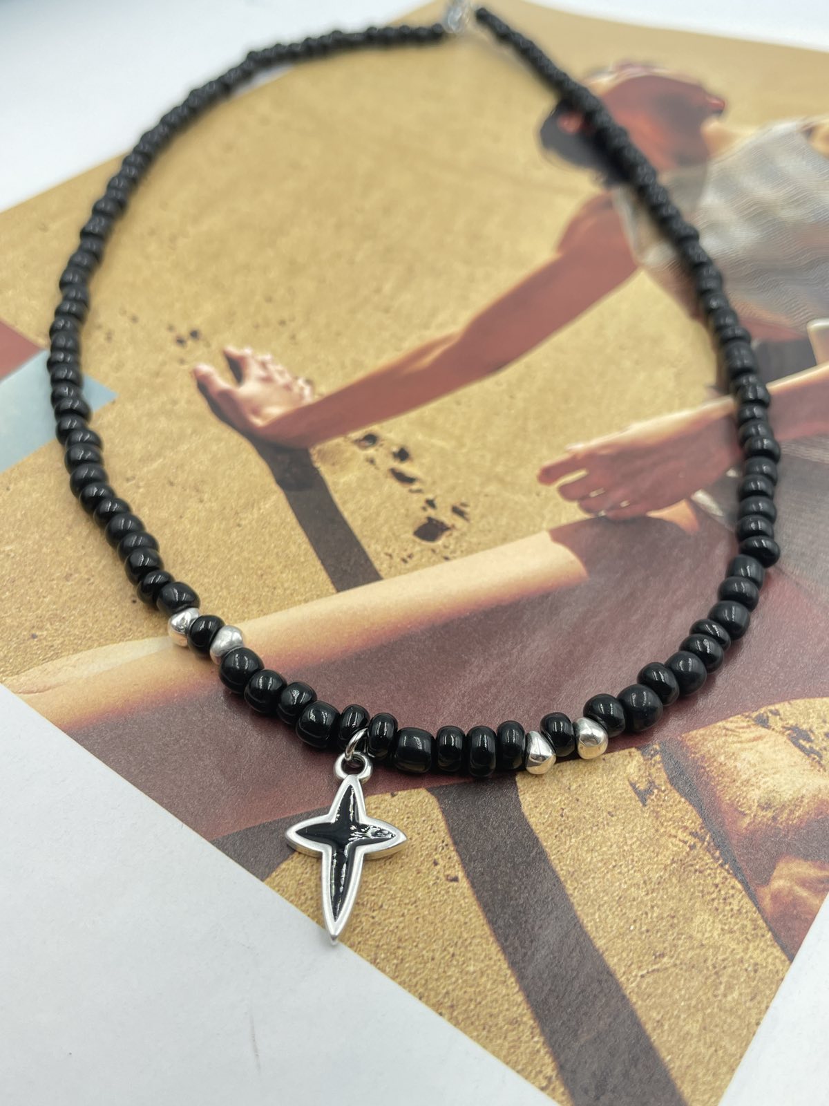 Χειροποίητο κολιέ με ημιπολύτιμες χάντρες και ατσάλινος σταυρός.