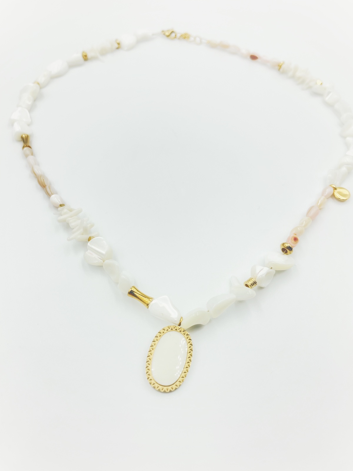 • Φίλντισι, χαολίτη, όνυχας, κοχύλι φυσικό, γυάλινες χάντρες, κρύσταλλα