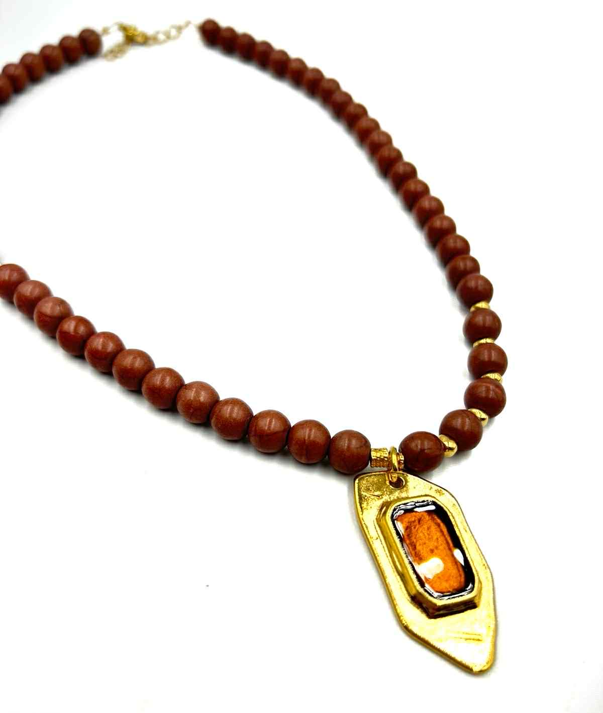 Χειροποίητο κολιέ με χάντρες όνυχα και ατσάλινο στοιχείο με μπρονζέ σμάλτο.