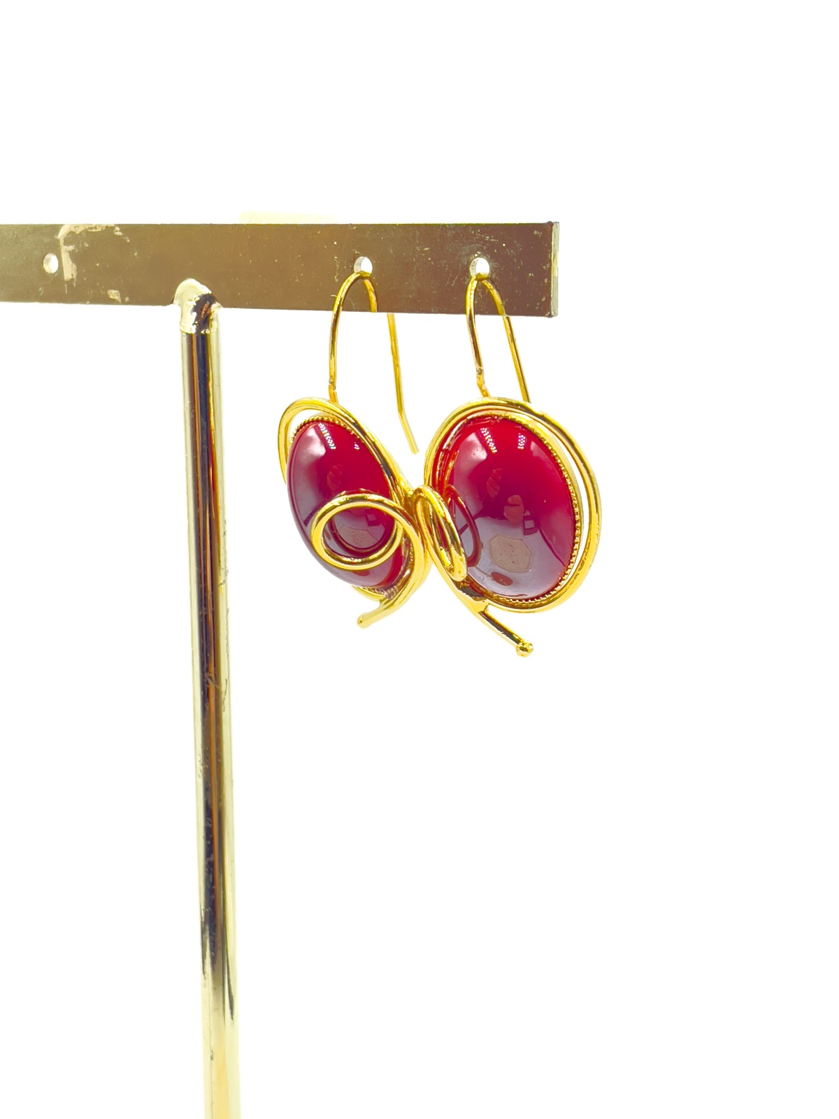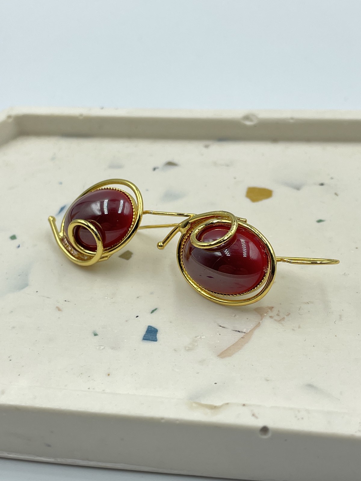 Χειροποίητο κόσμημα σκουλαρίκι οβάλ πέτρα κόκκινη με πλεχτό πάνω.